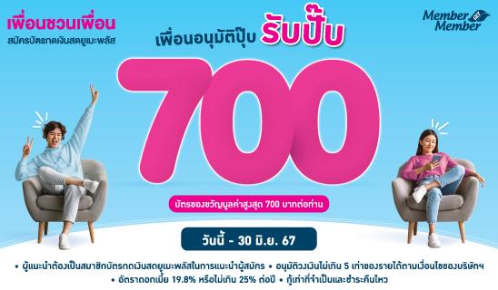 ชวนเพื่อนสมัครบัตรฯ อนุมัติปุ๊บ รับบัตรของขวัญสูงสุด 700 บาทต่อท่าน ไม่จำกัด