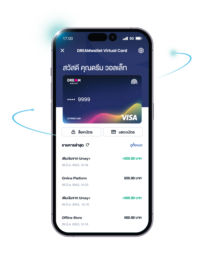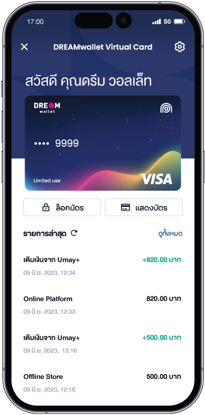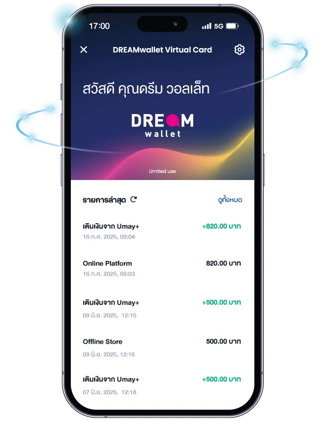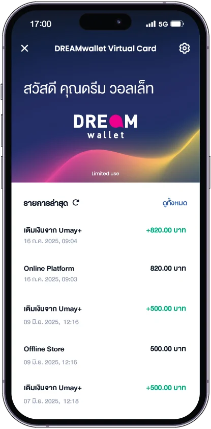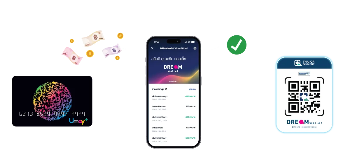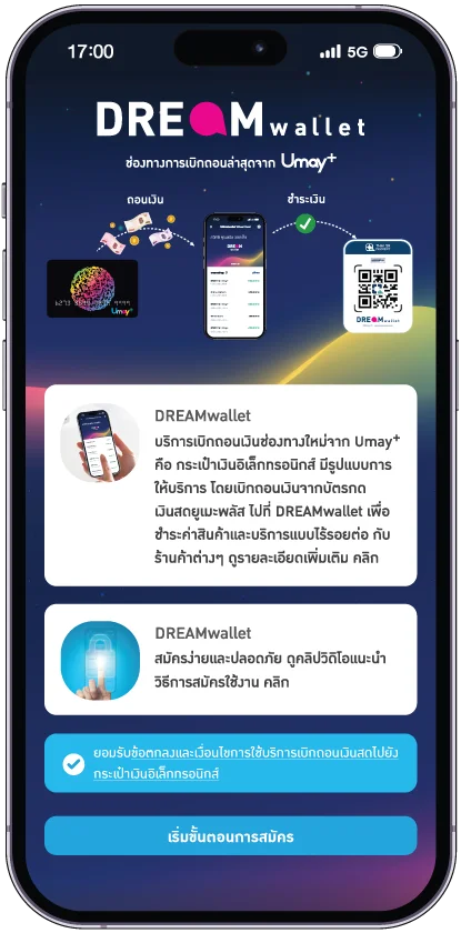 บริการเบิกถอนเงินช่องทางใหม่จาก Umay+ คือ กระเป๋าเงินอิเล็กทรอนิกส์ มีรูปแบบการให้บริการ โดยเบิกถอนเงินจากบัตรกดเงินสดยูเมะพลัสไปที่ DREAMwallet เพื่อชำระค่าสินค้าและบริการแบบไร้รอยต่อกับร้านค้าต่าง ๆ ทั่วประเทศ
