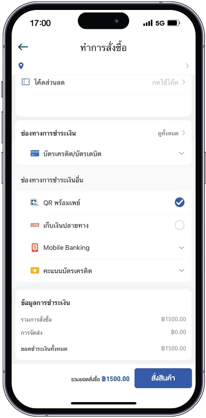 1. เข้าแอปพลิเคชันร้านค้าออนไลน์ที่ต้องการ ในขั้นตอนชำระเงินเลือกชำระเงินด้วย “QR พร้อมเพย์”