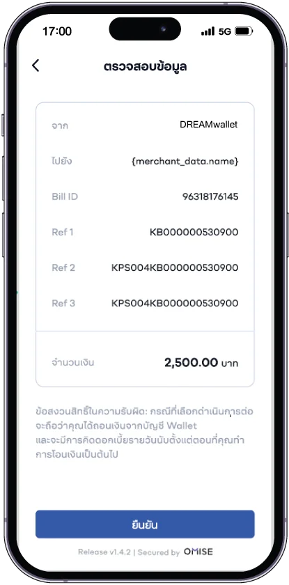 4. ตรวจสอบจำนวนเงิน ชื่อร้านผู้รับชำระเงิน และยืนยันการทำรายการ