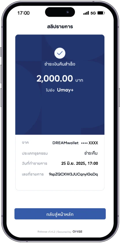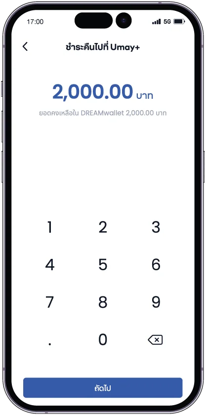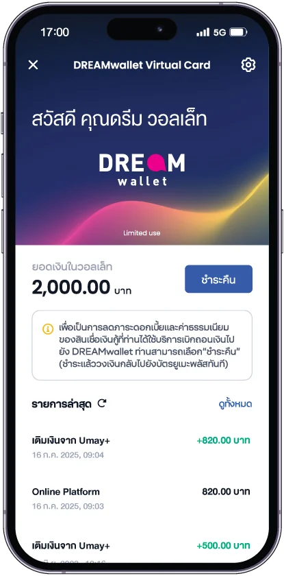 - กรณีที่การทำรายการสำเร็จและวงเงิน Umay+ ถูกตัดเรียบร้อยแล้ว แต่ลูกค้าต้องการยกเลิกการชำระค่าสินค้าและบริการ และต้องการให้เงินจำนวนดังกล่าวกลับสู่วงเงิน Umay+ เพื่อให้เกิดการหยุดคิดดอกเบี้ย ลูกค้าจะต้องทำการกดเมนู ‘ชำระคืน’ ที่หน้าของ DREAMwallet ด้วยตนเอง หากลูกค้าไม่ทำการ ‘ชำระคืน’ จาก DREAMwallet เข้าสู่วงเงิน Umay+ การคิดดอกเบี้ยเงินจำนวนดังกล่าวจะถูกดำเนินการต่อไป